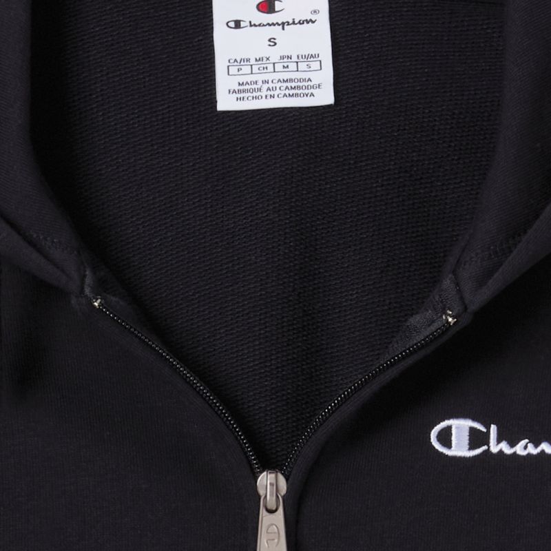 Champion Women's Full Zip Hoodie Sweatshirt, Black 118406 KK001. This Champion women's sweatshirt is perfect for everyday wear. Cotton is the dominant fabric. Polyester fibers are also included. Slim fit. Full-length zipper. Drawstring-adjustable hood. Elastic cuffs and hem. Two open side pockets for small items will also keep your hands warm when needed. Material: 69% cotton, 31% polyester.