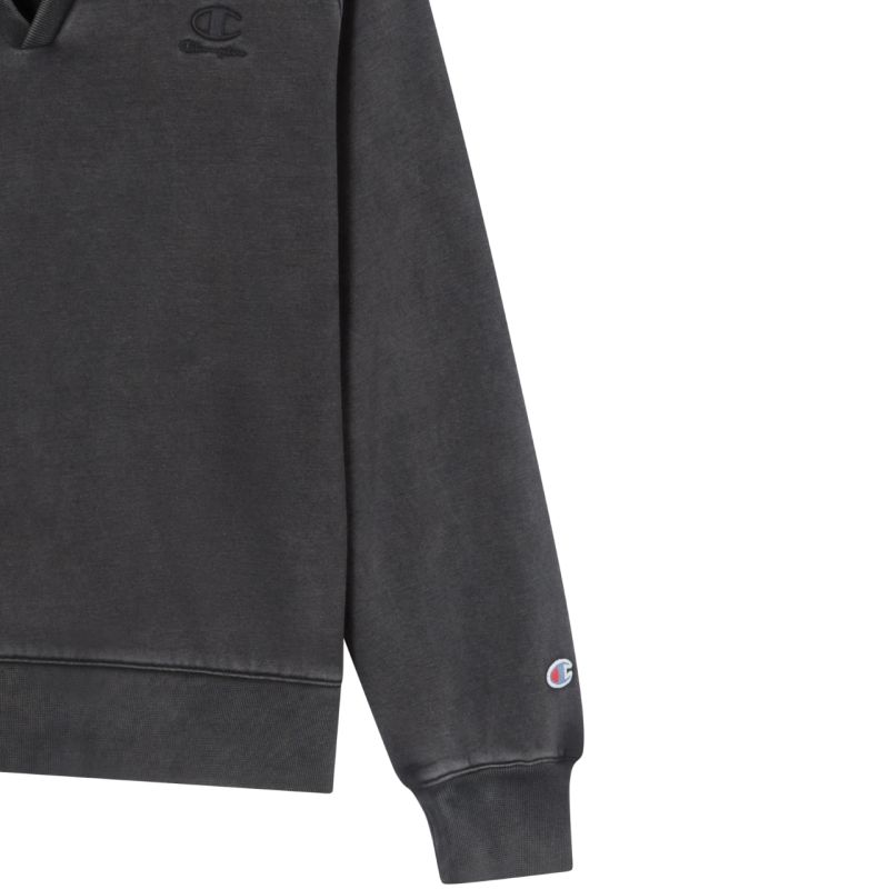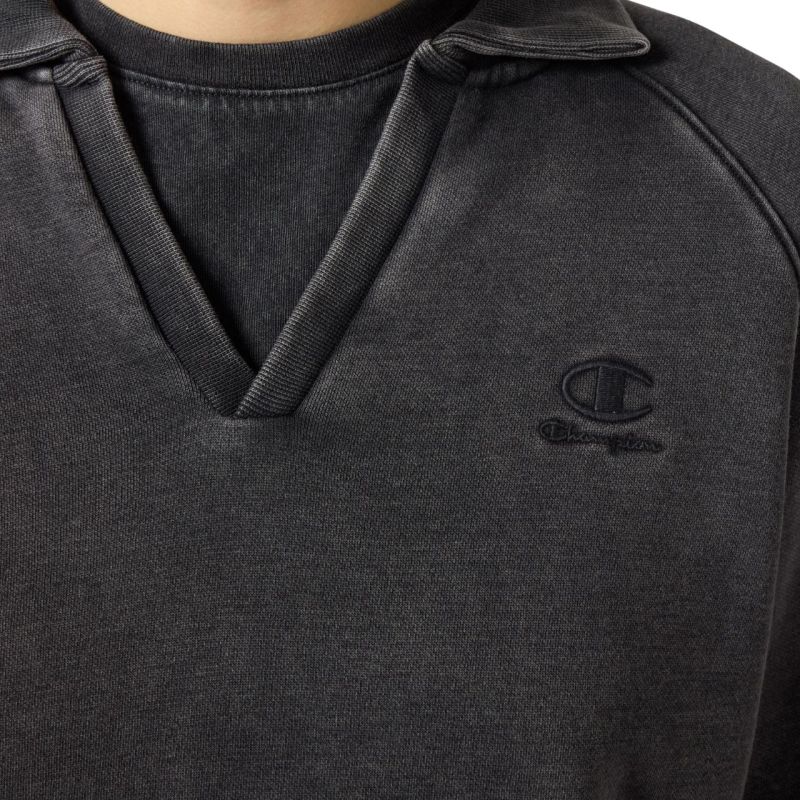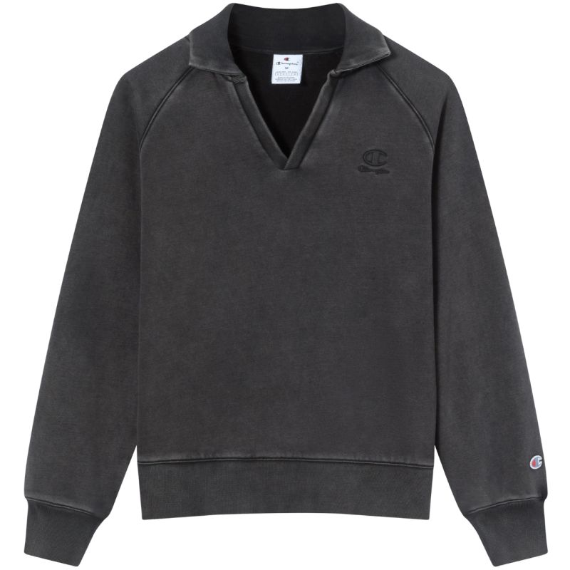 Champion Women's Polo Neck Sweatshirt, Gray 118366 KK001. This Champion women's polo sweatshirt is perfect for everyday wear. It features a collar and a V-neckline. The sweatshirt is made primarily of cotton fibers with some polyester. The hem and cuffs are ribbed. Regular fit. Material: 70% cotton, 30% polyester.