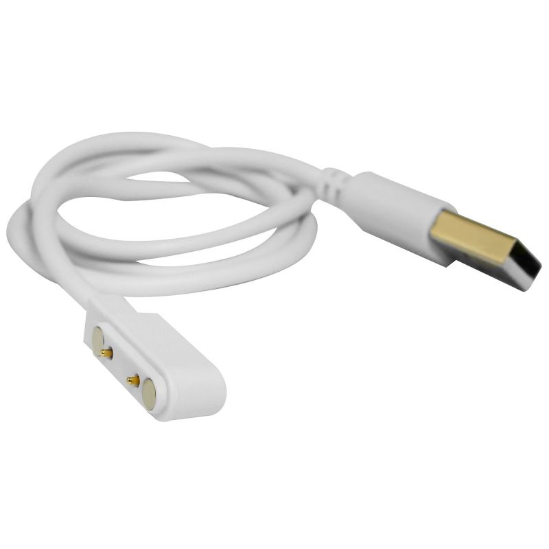 The cable is white, with a USB connector on one end and pins on the other that are attracted by a magnet.