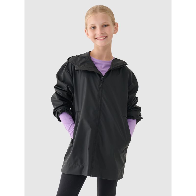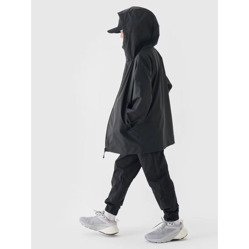 This children's transitional jacket features an integrated, non-adjustable hood. A high collar covers the neck, providing additional protection against cold and wind. There are two open pockets on the sides. This everyday jacket fastens with a one-way main zipper with an internal wind flap to prevent cold from entering the jacket.
