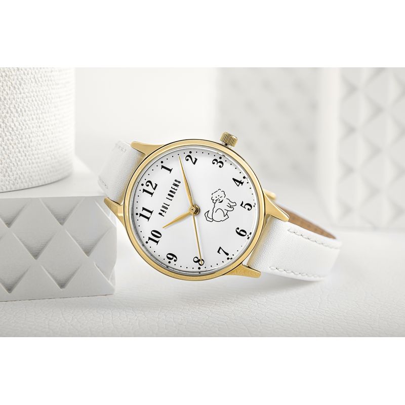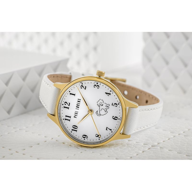The gold case harmoniously complements the white dial, which features an adorable puppy, adding a playful touch to the watch. This subtle graphic makes the watch a unique, personal accessory your little one will be proud to wear. Gold hands and indices add elegance, while the cleverly designed seconds hand, moving gracefully, will make learning to tell time a joyful and exciting adventure.