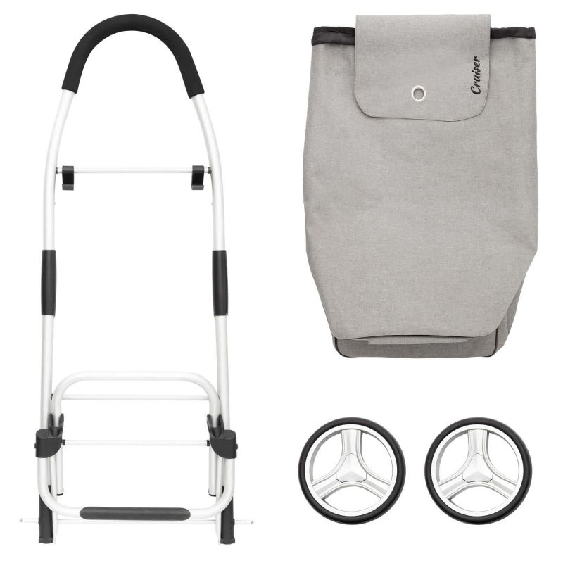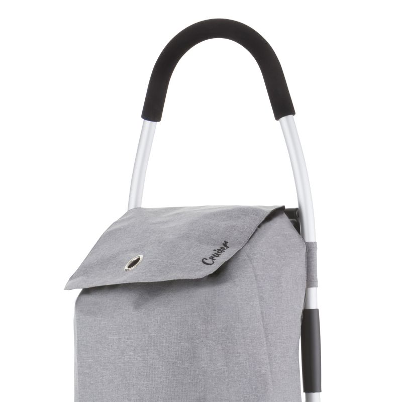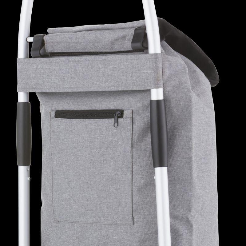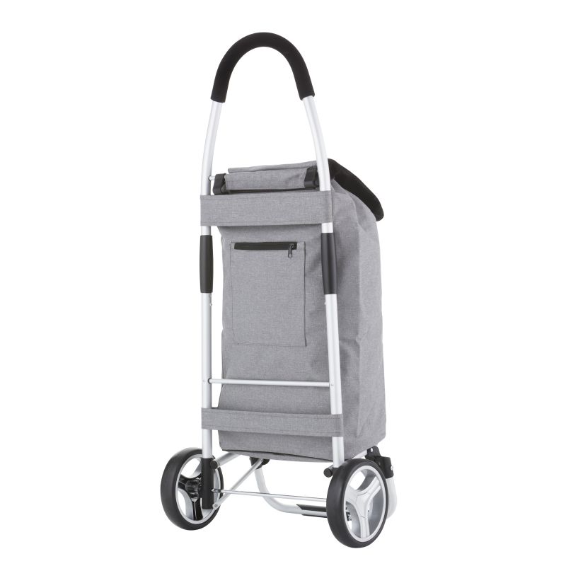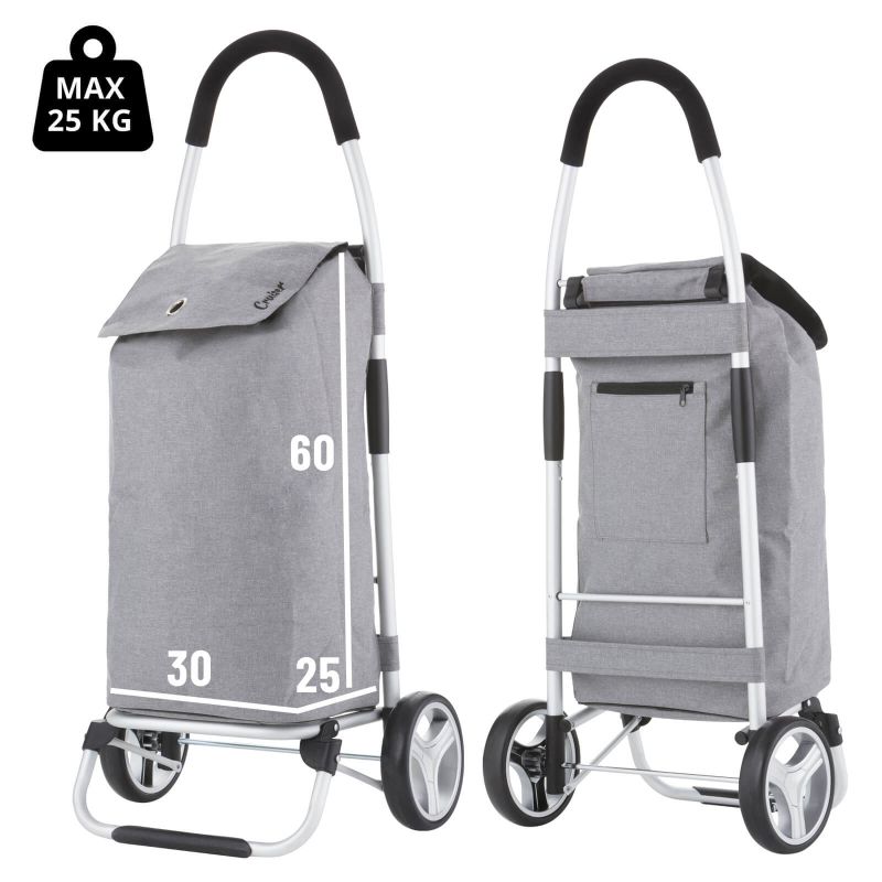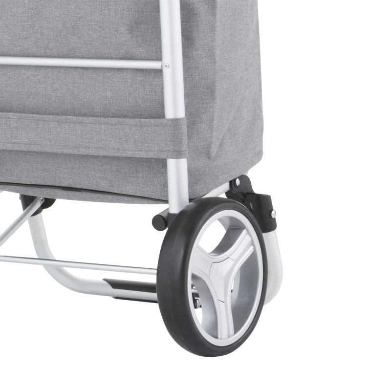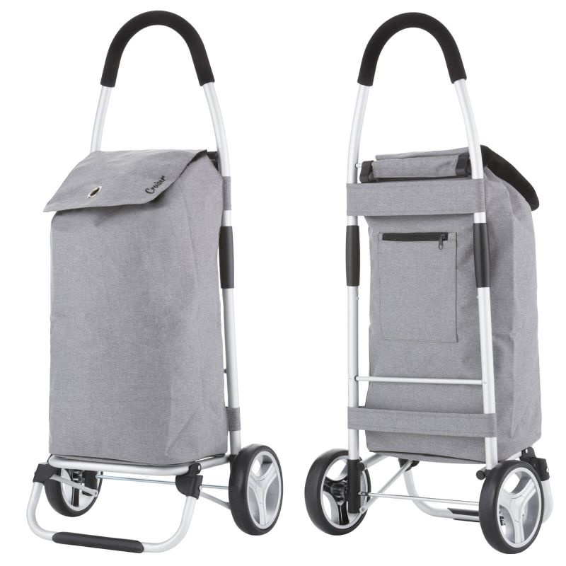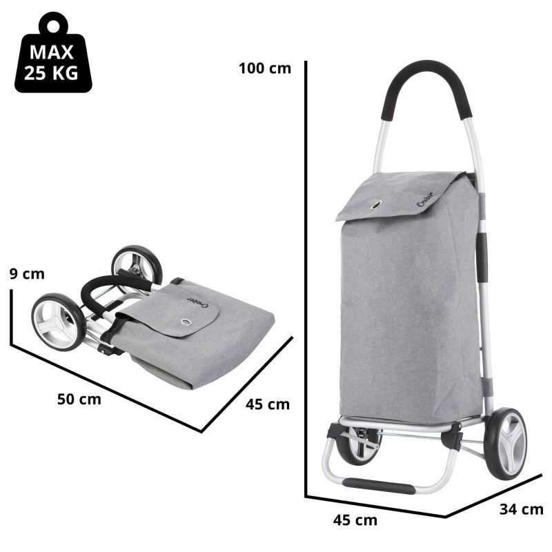 A practical, lightweight, and spacious shopping cart with a foldable design. It features a spacious 40-liter main compartment with a drawstring closure and a flap, as well as an additional zippered pocket on the back. A reinforced base, comfortable handle, waterproof construction, large wheels for all surfaces, and a quick and easy folding and unfolding system are its main advantages.