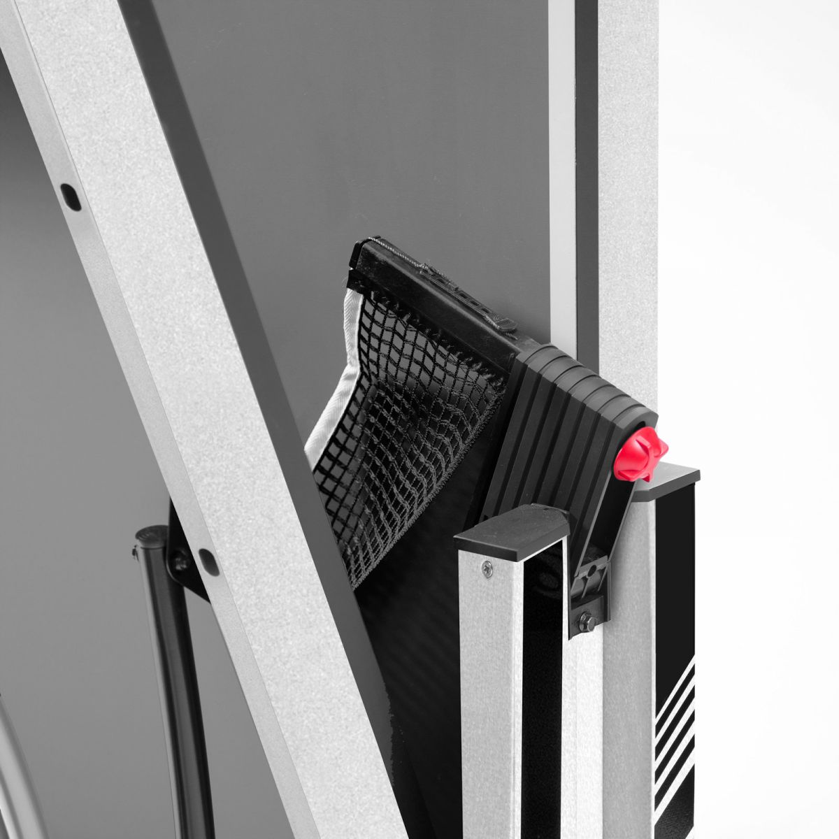 - RETRACTABLE NET When closing the table, the net automatically hides between the tabletops, which reduces the space taken up and ensures safety.