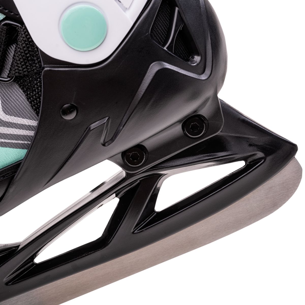 The HANOVER YB ice skates are designed for recreational skating. The semi-rigid boot construction provides excellent ankle and foot stability. An additional advantage of this model is that it can be adjusted to several sizes, allowing it to last for several seasons. The blades are made of stainless steel, extending their lifespan. Furthermore, the skates feature a buckle and Velcro closure for a precise fit.