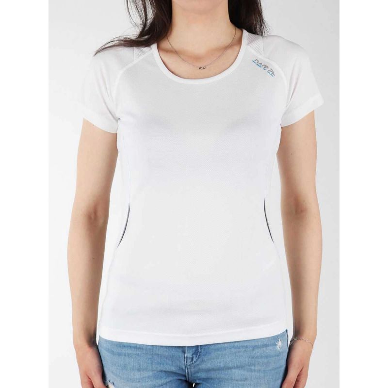 Material: 100% polyester. This women's t-shirt wicks moisture and dries quickly. Made of synthetic mesh, it's perfect for summer hikes, trekking, and other outdoor activities. Reflective elements are included for safety.