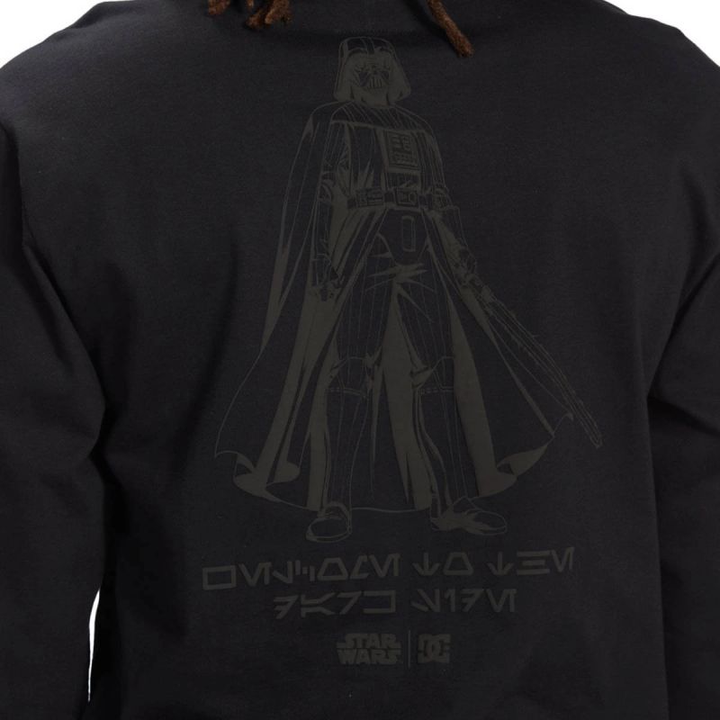 Inspired by Darth Vader™'s iconic black armor, this sweatshirt features a mesh pocket and a zipper at the chest, subtly paying homage to the design of Vader's suit, while a black-on-black print on the back depicts the Sith Lord himself, along with the Aurebesh lettering and the Star Wars™ X DC Shoes Collection logo.