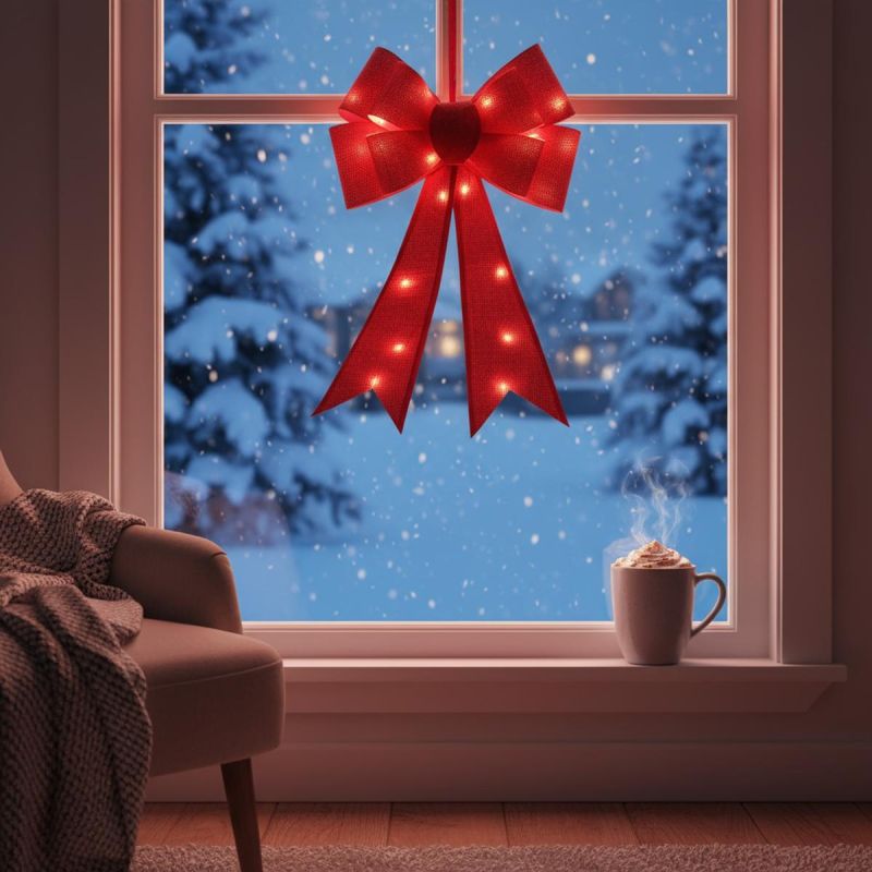 The 60CM RED DECORATIVE BOW (25 LEDs) is an elegant ornament that will perfectly enhance the holiday spirit in your home. Thanks to its 25 built-in, battery-powered LEDs, it will illuminate doors, windows, walls, or Christmas trees with a soft, warm light. This classic ornament will add elegance to any room and create a unique Christmas atmosphere.