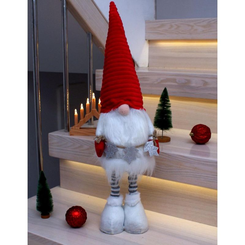 Santa Claus, a leprechaun, or a gnome are the guardians of a good atmosphere! Such decorations in your home are a sign of a successful holiday season! You can place this DECORATIVE SANTA WITH SILVER STARS ON TELESCOPIC LEGS 50-70 CM WHITE by the Christmas tree, among presents, by the fireplace, by the front door, or give it as a gift to a loved one. We assure you that the company of such a person will not only be a very pleasant visual attraction but will also make the holiday season more enjoyable. Our leprechauns, dwarves, and gnomes feel most at home among other friends from the Saska Christmas line.