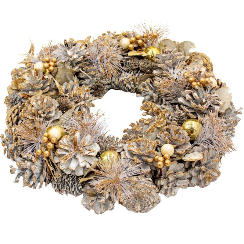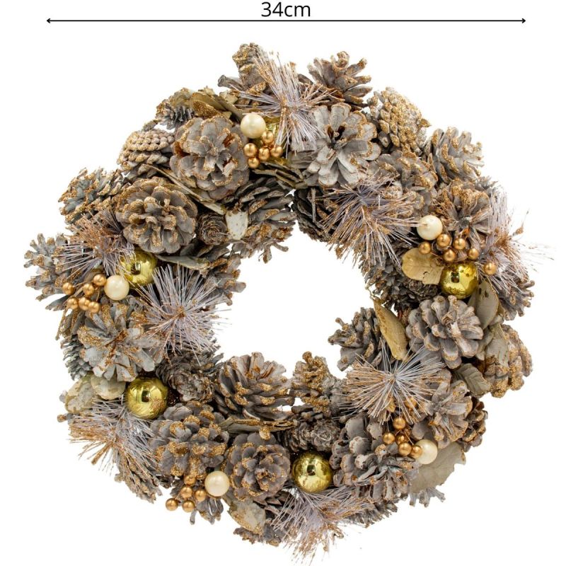 DECORATIVE WREATH 34 CM GOLD WITH PINES AND MICA BALLS
