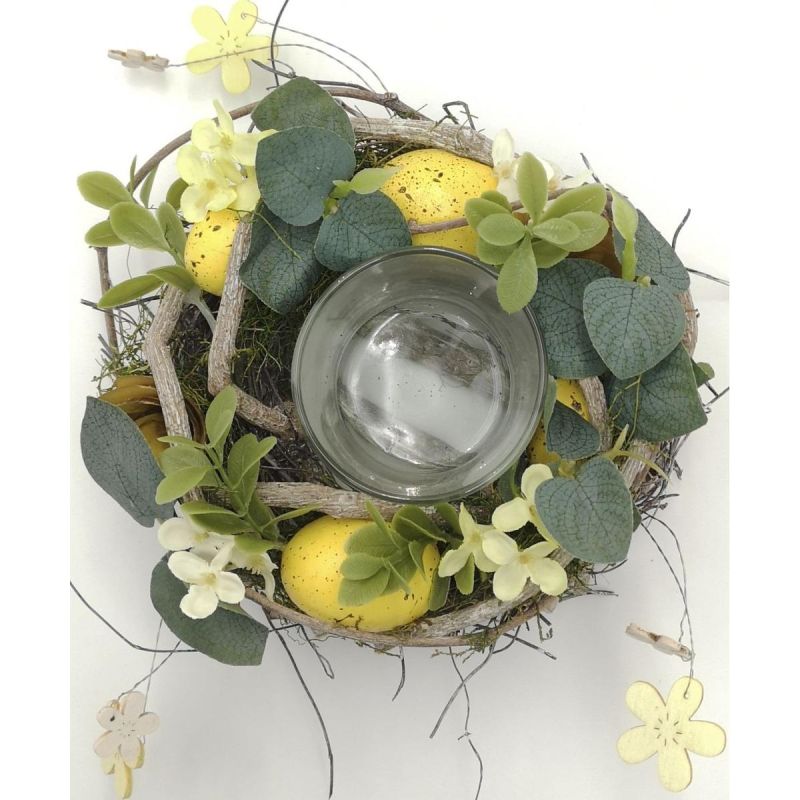 Our wreath is a charming Easter and spring decoration. The vibrant green leaves, yellow flowers, and speckled yellow eggs create a unique, natural composition. The wreath will adorn your home, and its colors will highlight the white of a tablecloth, the charm of a candle, or the shine of cutlery. The wreath can also be used to decorate your workspace.