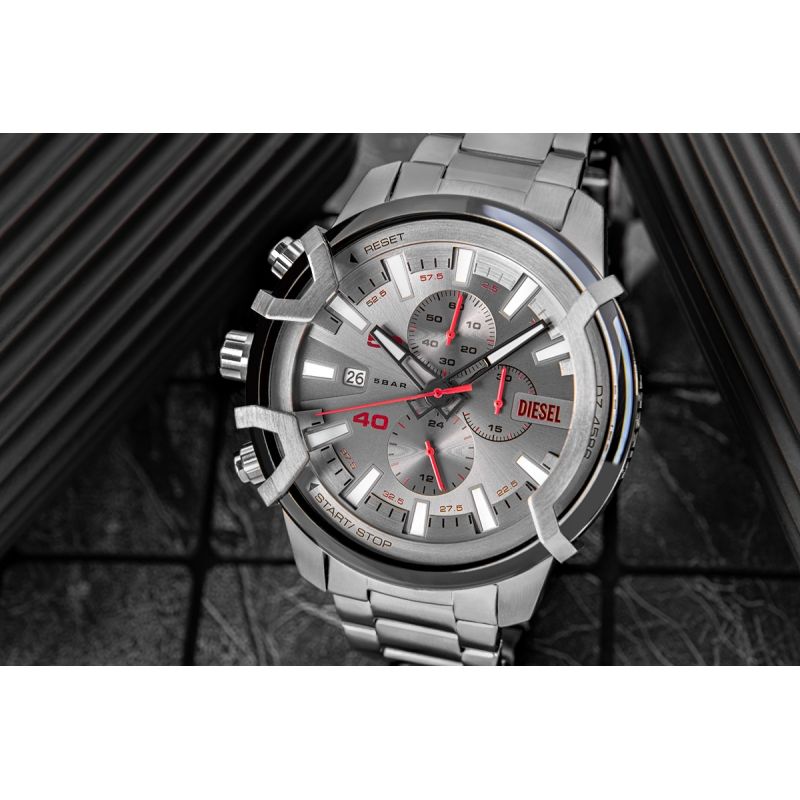 A silver-gray hue with a delicate, brushed finish creates a base that brings out the power of detail. Bold red accents on the hands and subdials bring dynamism and energy, as if the watch is ready for any action. Tall indexes and elements protruding from the dial surface give it a three-dimensional character, emphasizing the design's solidity and depth. Thanks to a luminescent coating on the hands and indexes, the time can be read even in low light, enhancing the model's practicality. The machine-engraved "DIESEL" inscription on the side of the case is a detail that speaks volumes about the character of this model – rugged, uncompromising, ready to meet the expectations of the most discerning men.
