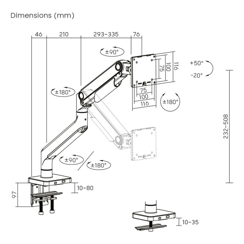 • Tilt angle range: -20 - 50°