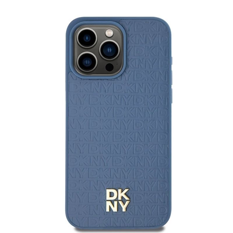 DKNY Leather Monogram Pattern Metal Logo MagSafe Case for iPhone 15 Pro Max - Blue