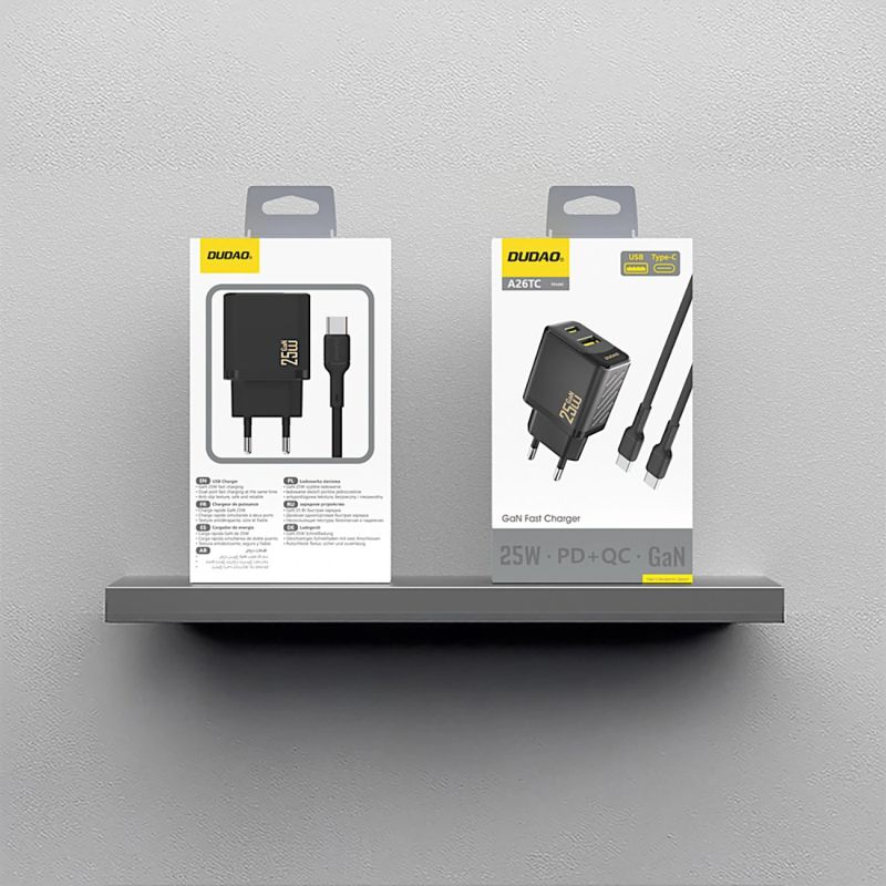 The Dudao A26TCEU wall charger is a modern and functional solution for fast charging mobile devices at home, in the office, and on the go. GaN technology combined with up to 25W of power ensures high efficiency in a compact size. Two ports – USB-C and USB-A – allow you to charge two devices simultaneously, while Power Delivery and Quick Charge support shorten charging times. The non-slip texture of the housing increases comfort and safety of use. The set includes a USB-C to USB-C cable, so the charger is ready to use right out of the box.