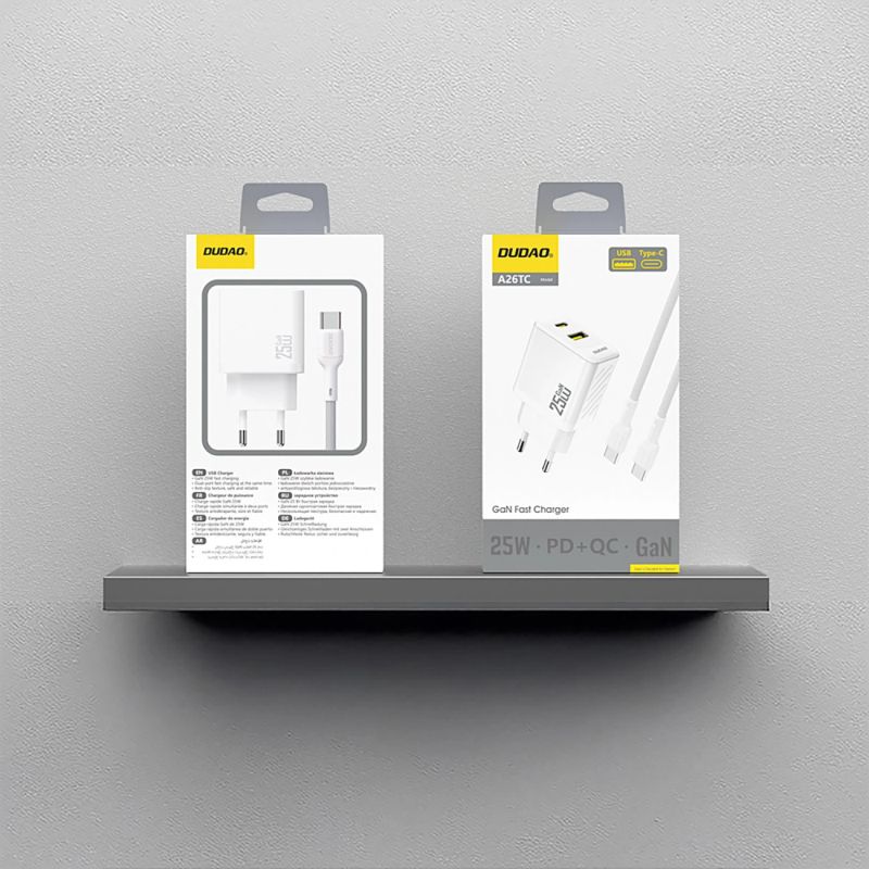 The Dudao A26TCEU wall charger is a modern and functional solution for fast charging mobile devices at home, in the office, and on the go. GaN technology combined with up to 25W of power ensures high efficiency in a compact size. Two ports – USB-C and USB-A – allow you to charge two devices simultaneously, while Power Delivery and Quick Charge support shorten charging times. The non-slip texture of the housing increases comfort and safety of use. The set includes a USB-C to USB-C cable, so the charger is ready to use right out of the box.