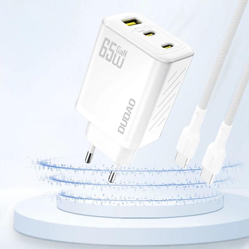 The Dudao A29 is a compact and efficient wall charger with up to 65W of power that allows you to quickly power multiple devices simultaneously. Equipped with two USB-C ports and one USB-A port, it provides flexibility in connecting smartphones, tablets, and laptops. Thanks to GaN (gallium nitride) technology, the charger operates stably, generates less heat, and offers higher energy efficiency. The built-in E-Mark chip intelligently recognizes the connected device, adjusting charging parameters for maximum safety. It's a practical solution both at home and on the go.
