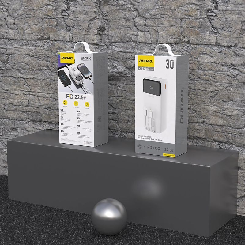 Dudao K15Max 30000mAh PD 22.5W Powerbank with USB-C and Lightning Cables - White