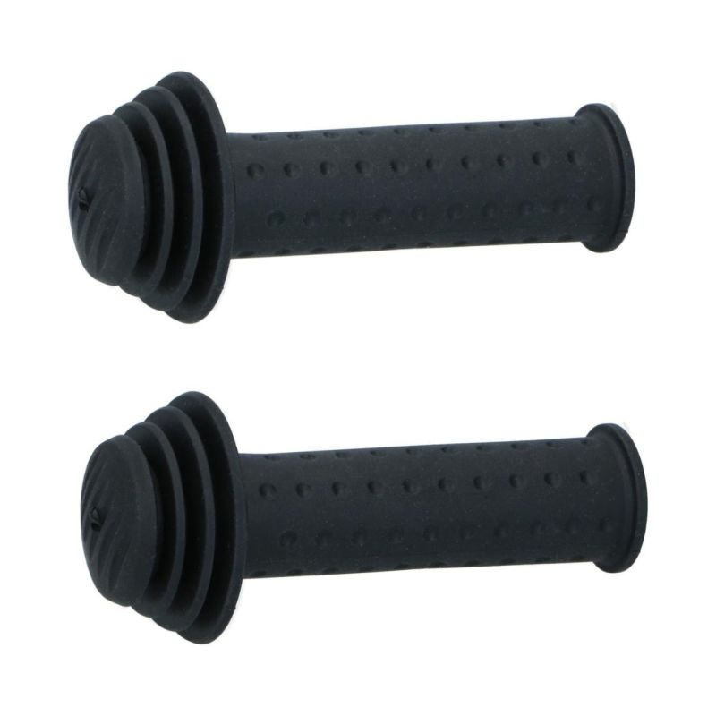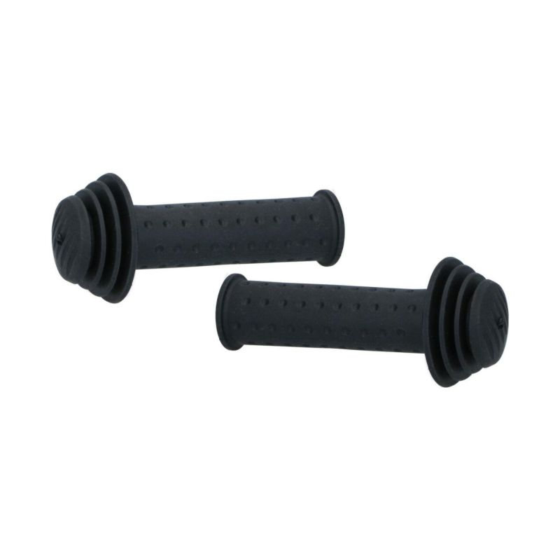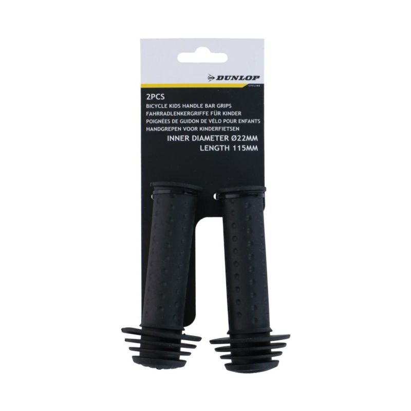 A set of handlebar grips. These 115mm grips fit 22mm diameter handlebars on 12- to 20-inch children's bikes. They are made of plastic, ensuring a secure grip and comfort while riding.