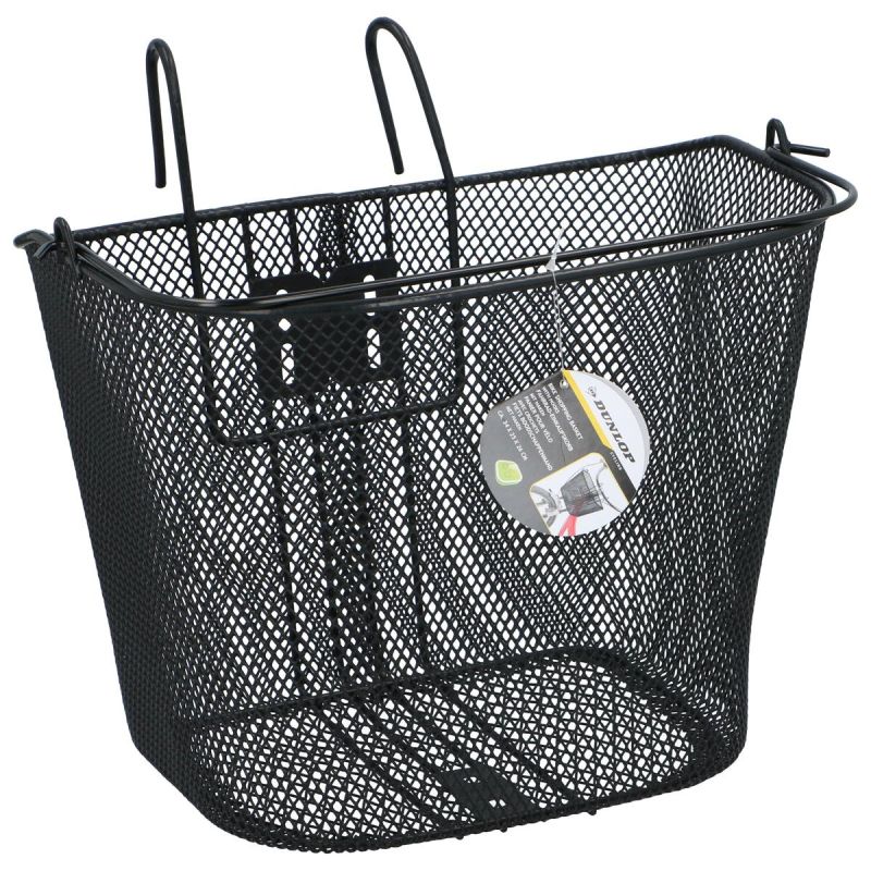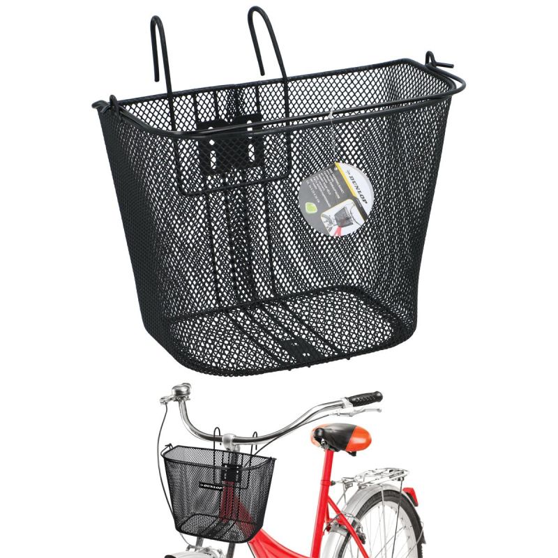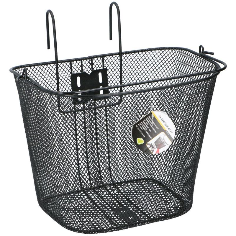 DUNLOP FRONT BICYCLE BASKET WITH TOWING MOUNTS is made of powder-coated steel, has a capacity of approximately 20 l, is characterized by high durability and resistance to deformation, numerous small holes in the mesh ensure that small items do not fall out while riding.