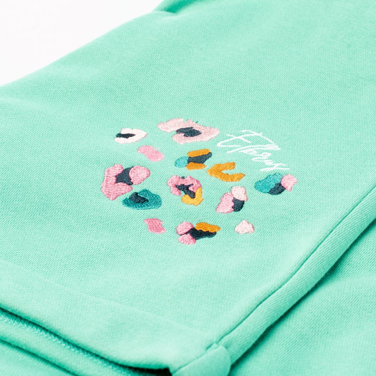 A wide elastic waistband with a drawstring allows for an adjustable fit. An embroidered logo with colorful spots completes the look.