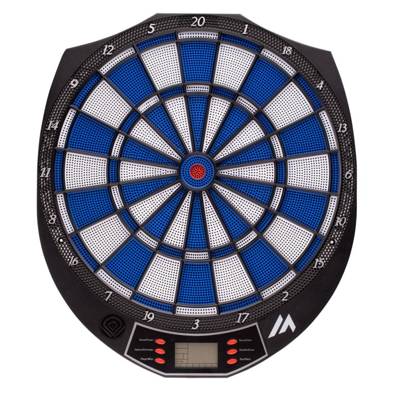 ELECTRONIC DARTBOARD LCD DISPLAY DIMENSIONS: 43 x 37.8 x 2.1 cm WEIGHT: 1.5 kg MATERIAL COMPOSITION: BOARD: PP BUTTON: ABS LCD: GLASS DART: - BARREL: IRON - SHAFT: POM - LEAF: PLASTIC - TIP: POM SPECIFICATIONS: - BATTERY: 3 x AA 1.5 V - 159 GAMES, 18 CATEGORIES - 6 DARTS INCLUDED - UP TO 8 PLAYERS