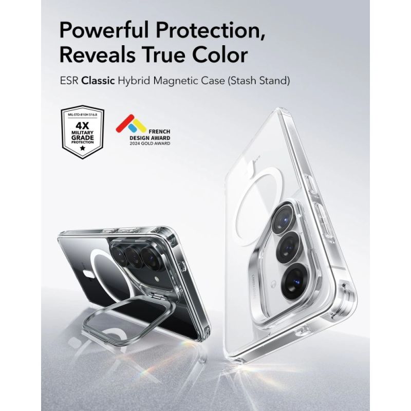 The ESR Classic Hybrid Kickstand MagSafe is an advanced case that combines protection with functionality while maintaining a minimalist, slim design. Strong polycarbonate and acrylic backs, combined with a flexible TPU frame, provide solid protection without adding bulk or detracting from the phone's appeal. Reinforced corners effectively absorb impact, making potential drops a practical everyday accessory.