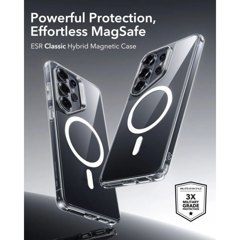 The ESR Classic Hybrid MagSafe is a hybrid case that combines minimalist design with advanced protection. A transparent acrylic layer wrapping the back and sides of the phone complements a durable frame made of soft, thermoplastic TPU material, which effectively absorbs shocks and protects the device from drops.