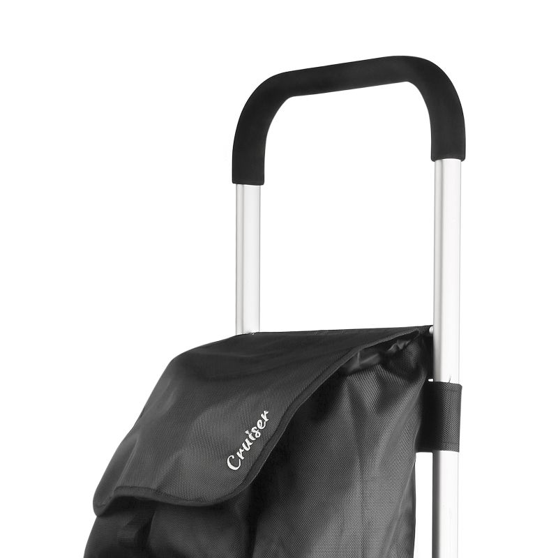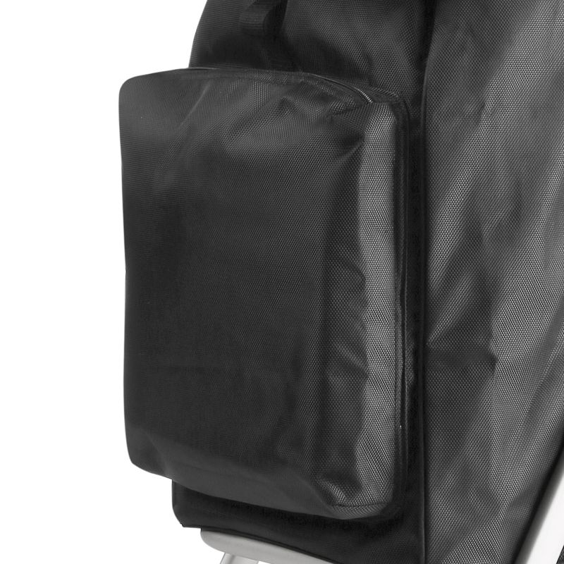A practical and spacious shopping cart with 6 wheels for easy maneuvering up and down stairs. The cart features a spacious 30-liter main compartment with a drawstring closure, a front insulated pocket (fridge function), and an additional zippered pocket on the back. A reinforced base, a comfortable handle, a top flap with a clip, and waterproof construction are its main features.