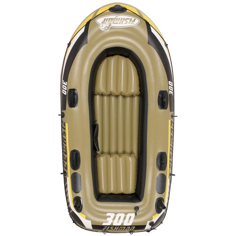 2 plastic oars - 124 cm, pump, tow rope for gripping around the pontoon (approx. 360 cm), oar holders, 2 fishing rod holders, bag for small items, repair kit, 2 seat cushions
