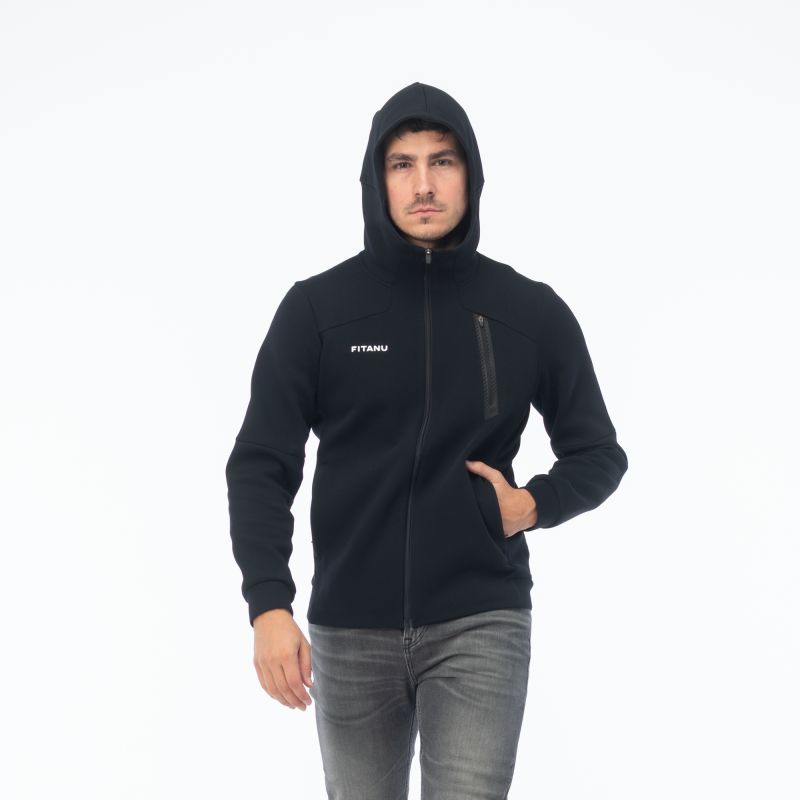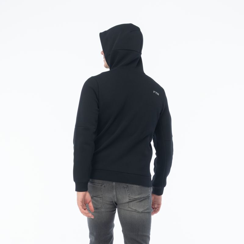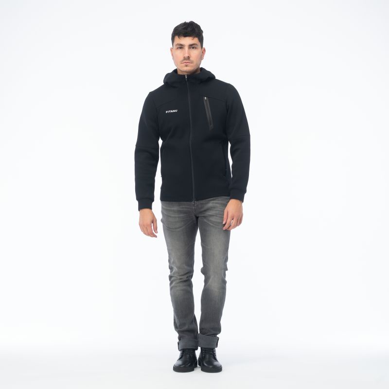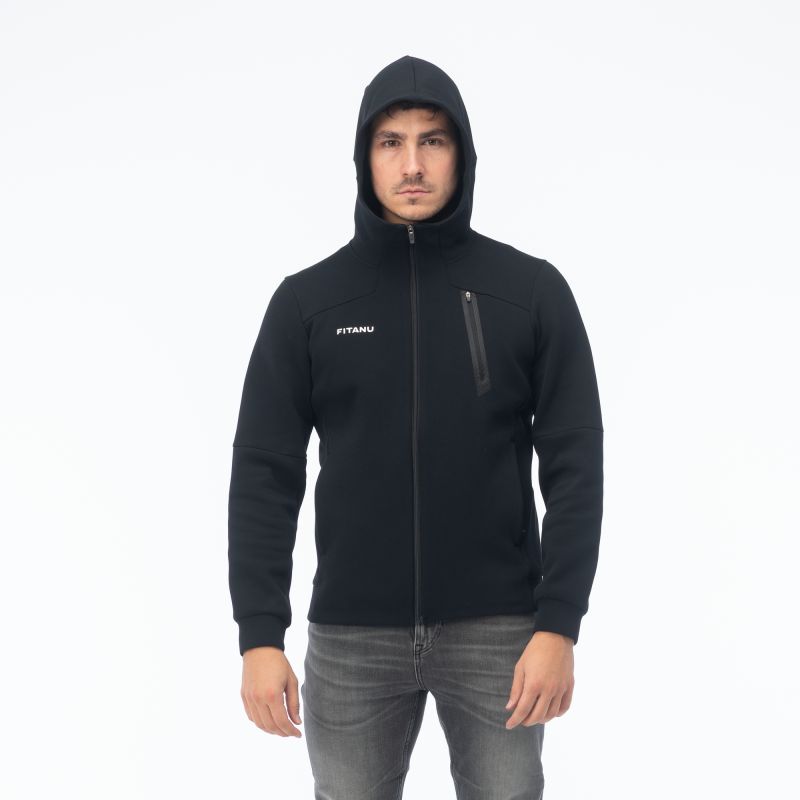 The black BENKAR men's sweatshirt from Fitanu features a simple, sporty cut that complements more than just a casual outfit. A full-length zipper makes it easy to put on and take off. The spacious, integrated hood protects you from gusts of wind. Two zippered side pockets allow you to safely stash your phone or keys. An additional chest pocket and reflective elements are other highlights of this product.