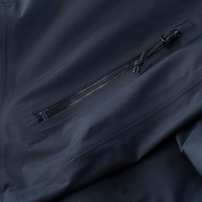 The men's FTN PRO JACKET SYMPATEX® trekking jacket features a poreless (hydrophilic) membrane that absorbs moisture from the body and evaporates it to the outside. Sympatex® is a thin, waterproof membrane with excellent breathability. A DWR coating applied to the jacket's fabric increases water resistance. Laminated zippers and taped seams further enhance the fabric's waterproofness. The straight cut allows for unrestricted movement while hiking. The integrated, adjustable hood and drawstring waist allow for a personalized fit. This model features an internal pocket and an additional chest pocket. A two-way zipper, adjustable cuffs, and reflective elements are other advantages of this product.