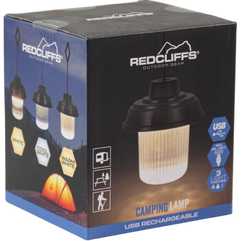 The REDCLIFFS BLACK 3-LIGHT USB CAMPING LAMP is designed with portability and convenience in mind. With an 800 mAh rechargeable battery, you'll be free from disposable batteries. Charging via a USB Type-C port guarantees quick recharging – all you need is a power bank, laptop, or charger.