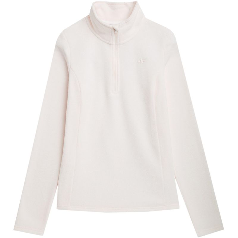 Women's 4F F031 Cream Fleece Sweatshirt 4FAW23UFLEF031 12S This women's 4F fleece sweatshirt is a warming layer (second layer) that can be worn under a jacket or ski suit. It's perfect for skiing, snowboarding, trekking, running, or everyday wear. It features a high neckline with a high collar. A short zipper at the neckline ends with a chin guard. Made of soft, lightweight microfleece, 4FWarm technology helps maintain a constant body temperature. Material: 100% polyester