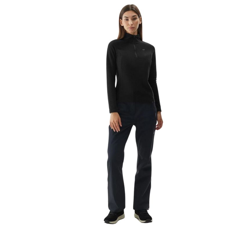 Women's 4F F031 Fleece Sweatshirt, Deep Black 4FAW23UFLEF031 20S. This women's 4F fleece sweatshirt is a warming layer (second layer) that can be worn under a jacket or ski suit. It's perfect for skiing, snowboarding, trekking, running, or everyday wear. It features a high neckline with a high collar. A short zipper at the neckline ends with a chin guard. Made of soft, lightweight microfleece, 4FWarm technology helps maintain a constant body temperature. Material: 100% polyester