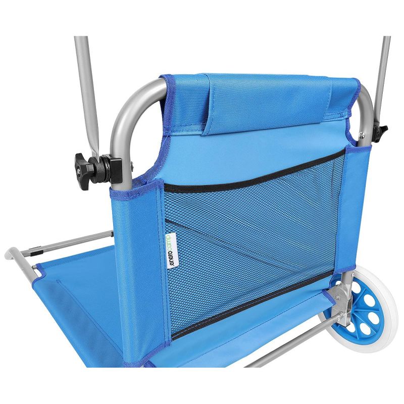 Planning some sweet laziness on the beach by the lake, in the garden, on the terrace, or on the balcony? Enjoy your relaxation on the lightweight and comfortable FOLDABLE BEACH CHAIR WITH CANOPY ON WHEELS 116x62x62-90CM BLUE!