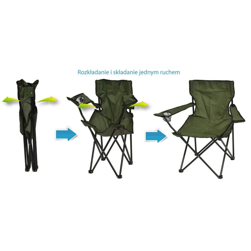 The 50x50x80cm Green Folding Camping Chair is the foundation for a successful camping trip, vacation, beach, lake, or simply a day out in the garden. Thanks to its easy-to-use spider-leg design, it's ready whenever you need it, thanks to its lightning-fast folding and unfolding system. The seat and backrest are made of durable and water-resistant fabric , making them resistant to abrasion, stretching, and tearing. Easy to clean; simply wipe with a damp cloth if dirty. The chair's ergonomic design will ensure hours of comfortable seating, while the comfortable armrests allow you to find a comfortable position, relieving pressure on your spine. The chair's frame, made of sturdy and durable steel tubing, can support a load of up to 100 kg!