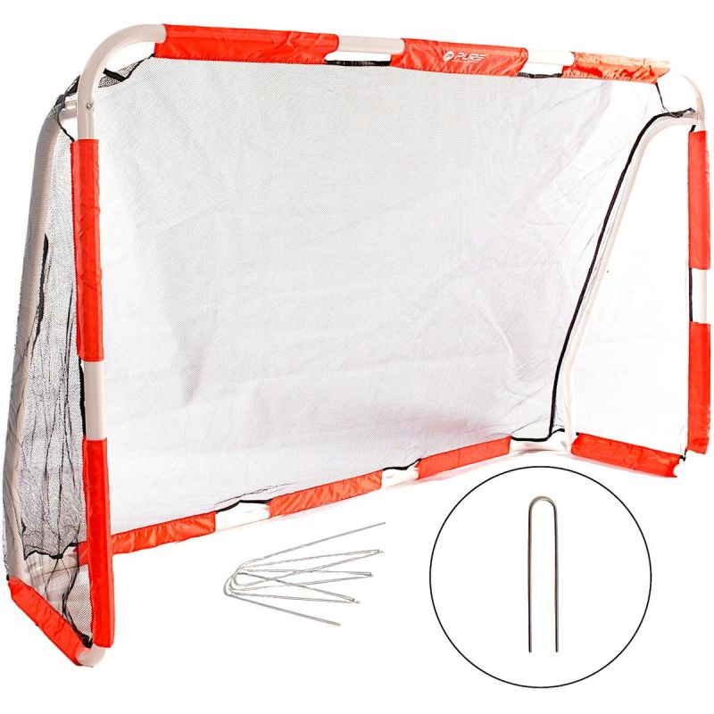 - The set includes: foldable goal, net, 4 U-shaped pegs, instructions.