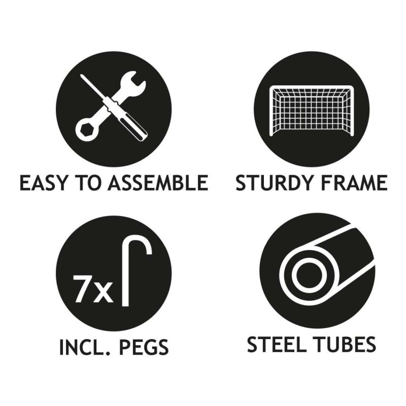 The goal is very stable, constructed from powder-coated steel tubes (profiles) with a diameter of 32 mm. Forget about the goal tipping over after every shot; the mounting pegs will additionally secure the goal to the ground.