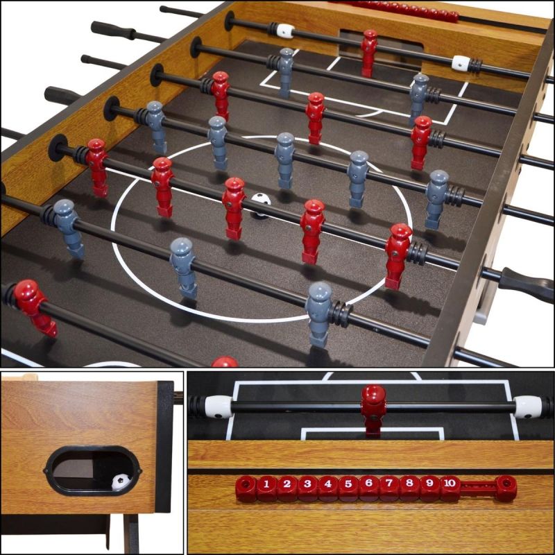 The playing surface is smooth and durable, ensuring smooth ball movement. The pitch lines are clearly marked, adding to the realism of the game. The 22 well-balanced football player figurines, made of durable plastic, are mounted on guides with stoppers, allowing for precise ball control.