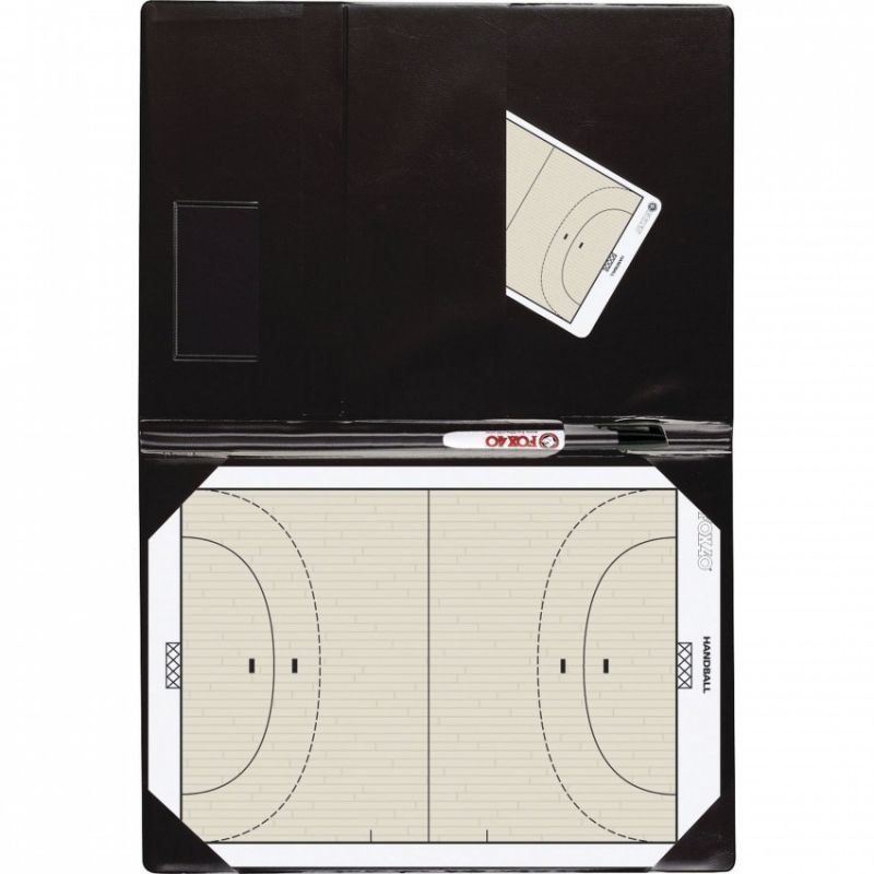 FOX40 Handball coaching board with briefcase Special surfaces for writing with a marker Two sides: One with a full field and the other with a half-field enlargement Set includes: Vinyl case with pockets and a carrying strap, two double-sided boards (one large, the other pocket-sized), marker Dimensions: 28x38 cm