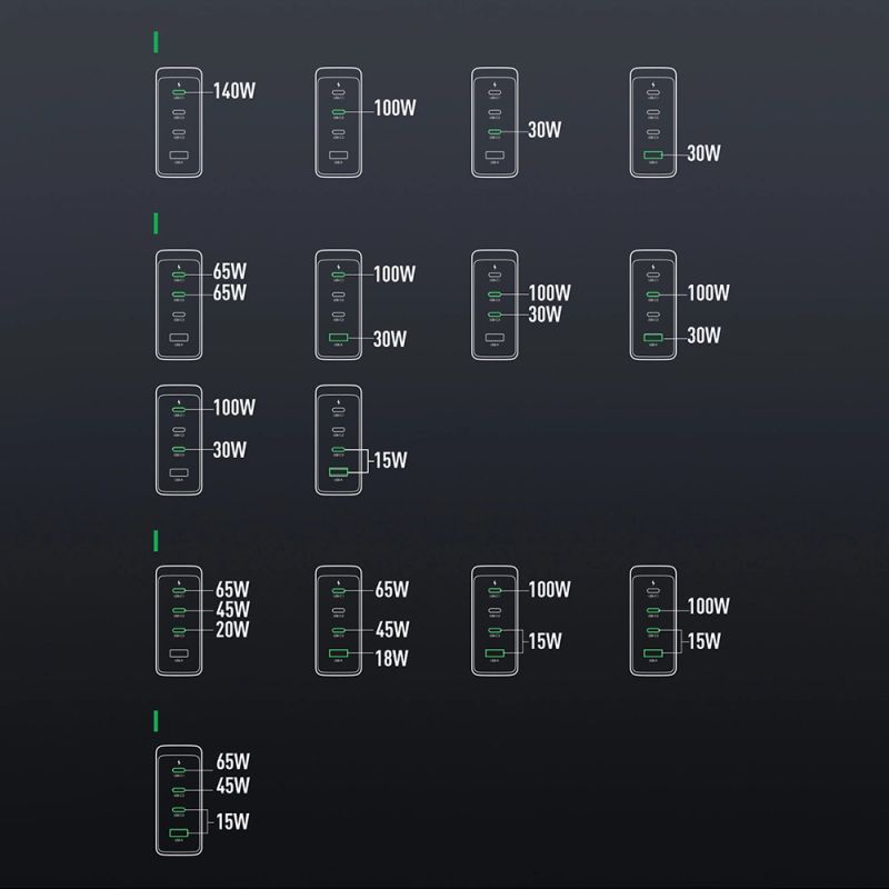 - USB-C 1 + USB-C 2 + USB-C 3 + USB-A: 65W + 45W + 15W