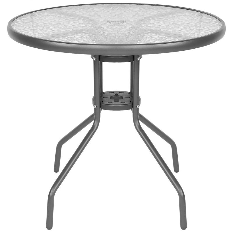 - Material: powder-coated steel - frames, 160g polyester - umbrella, textilene seats, table - tempered glass