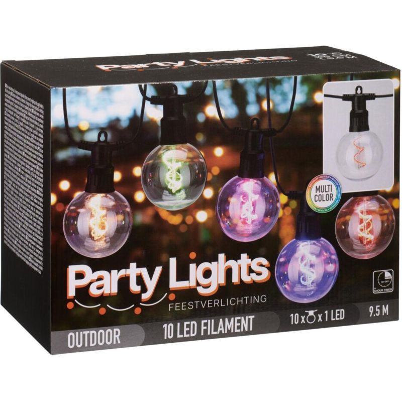 The PARTY LIGHT 10 LED G80 MULTICOLOR GARDEN GARLAND WITH TIMER – 9.5 m is the perfect solution for anyone looking to create a unique outdoor atmosphere! The colorful G80 bulbs combined with the timer function provide not only an eye-catching look but also ease of use – no need for daily turning on and off.