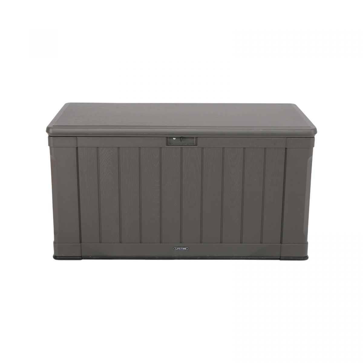 This 439-liter garden storage unit comes with a 10-year limited warranty from Lifetime. It features an aesthetically pleasing wooden slatted design.