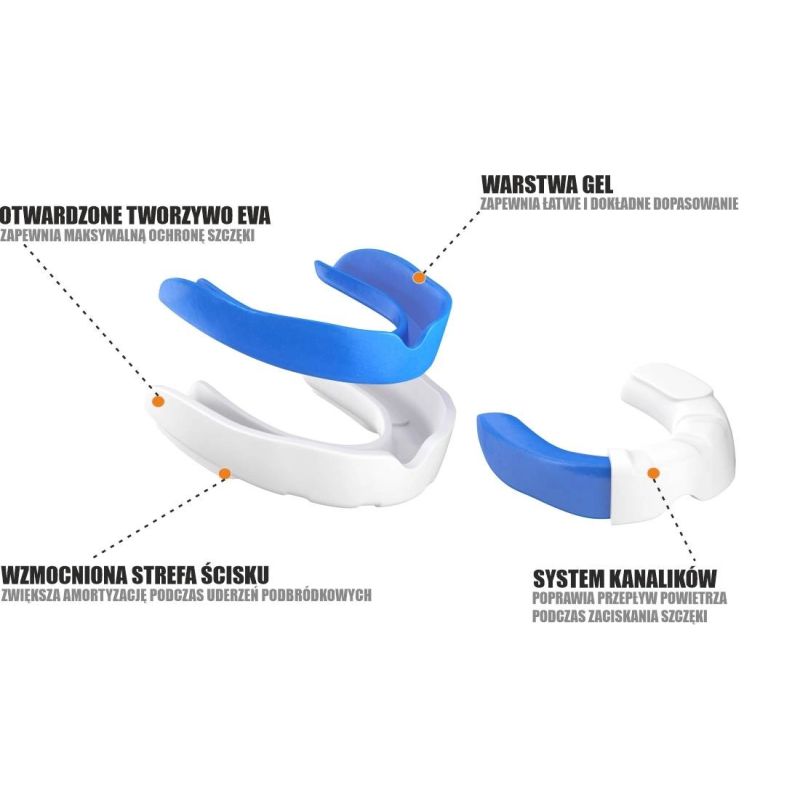 White/Blue is a mouthguard that knows no words. Its dual shield—silicone and gel —gives you what you need: armored protection and a perfect fit . Contoured ridges on the outside lock the mouthguard in place, while air channels allow you to clench your teeth without losing your breath.