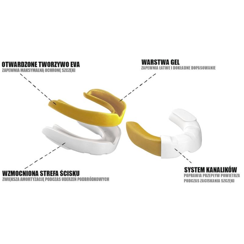The Gold/White is a mouthguard that knows no words. Its dual shield—silicone and gel —gives you what you need: armored protection and a perfect fit . Contoured ridges on the outside lock the mouthguard in place, while air channels allow you to clench your teeth without losing your breath.