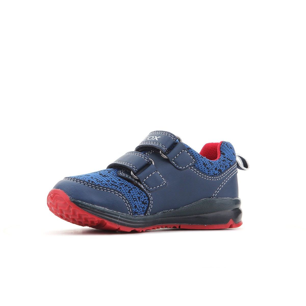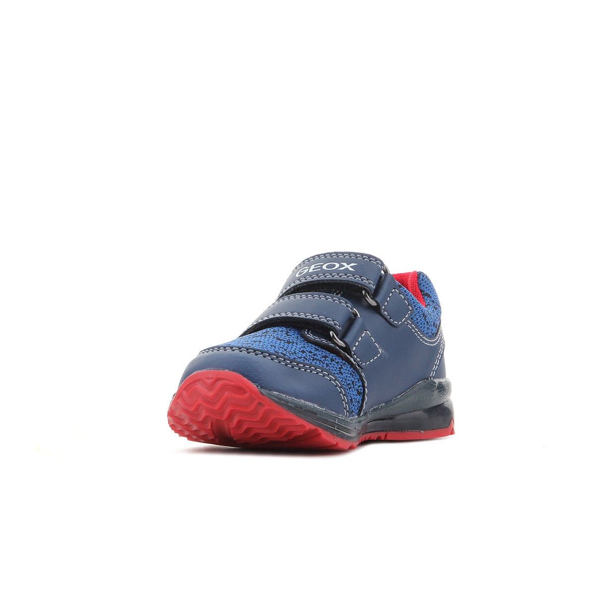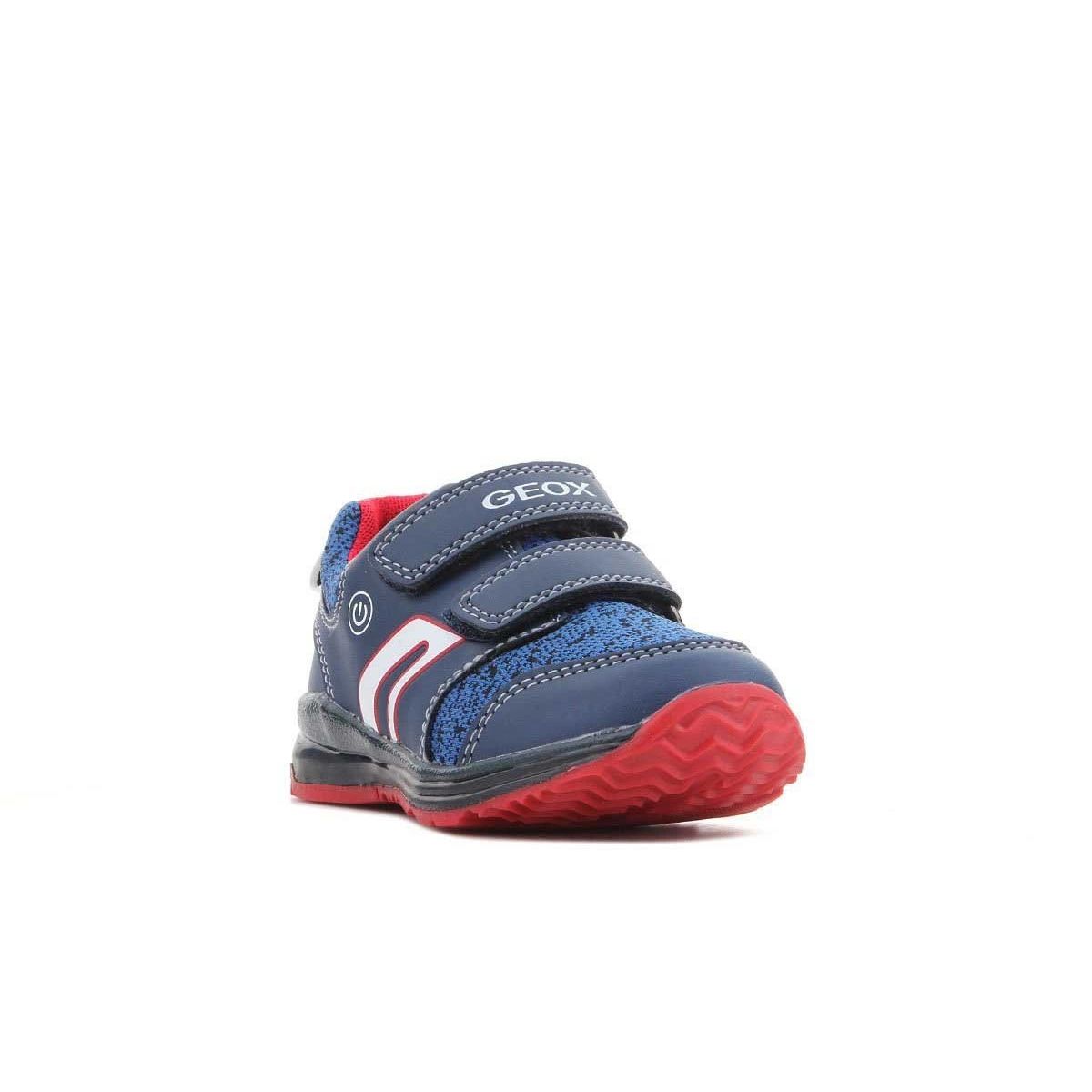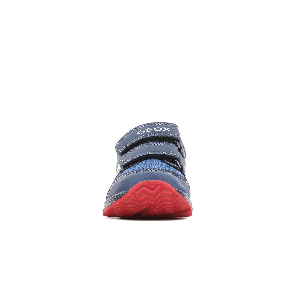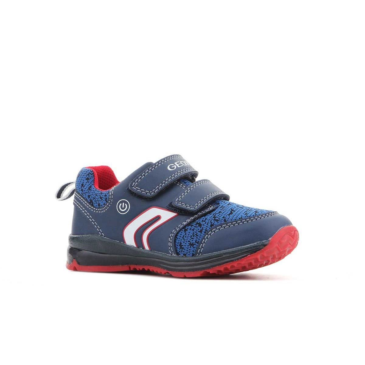 Boys' shoes by Geox. The navy blue upper fastened with two Velcro straps is made of a combination of textile and synthetic materials. The upper is enhanced by white inserts. An additional heel pull tab. The antibacterial leather insole conforms to the shape of the foot. The red sole is made of high-quality material. Geox Respira - a perforated sole that absorbs and expels sweat without allowing water to enter the shoe. The foot remains dry and at a comfortable temperature. Flexy System - a breathable, flexible, and slip-resistant sole facilitates natural foot flexion.