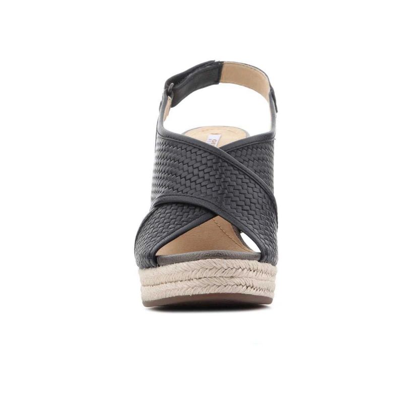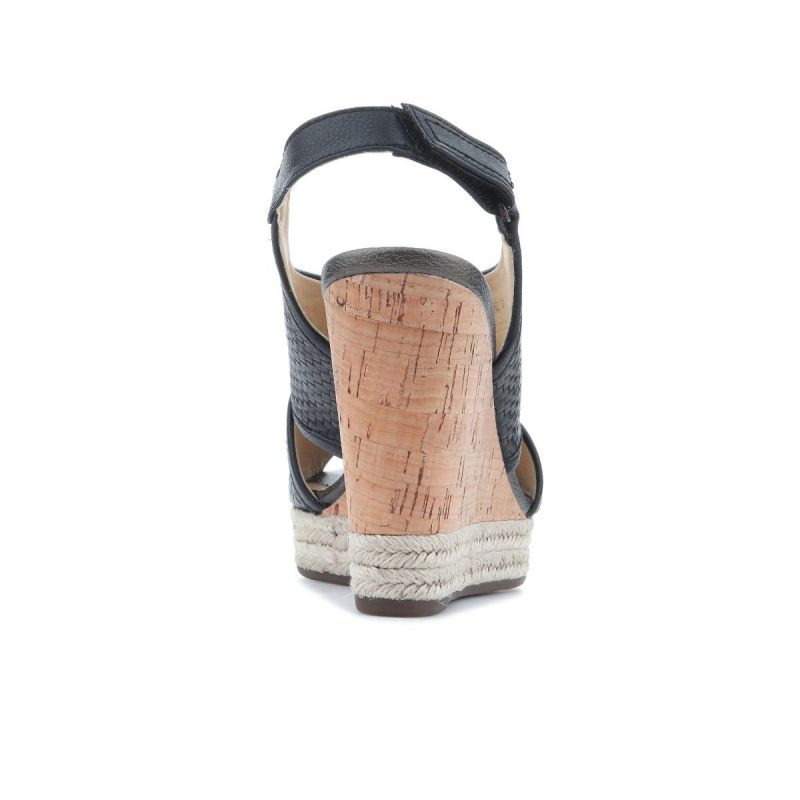 Summer women's sandals with a cork-like wedge. The black upper has a braided texture. The heel strap is adjustable with Velcro. The heel is 10 cm high. The 2 cm thick sole is finished with a braided cord around the entire length. Recommended for spring and summer 2018!
