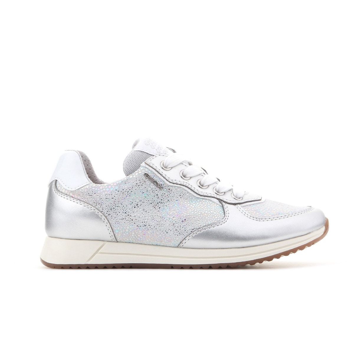 - The silver lace-up upper features silver-shiny inserts.