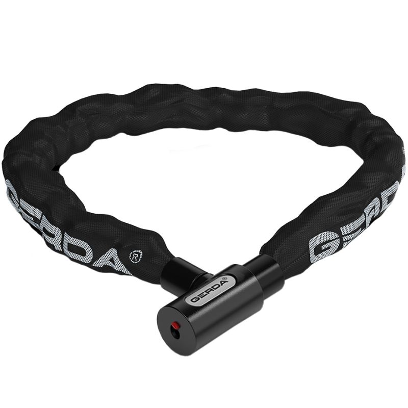 Gerda Chain Bicycle Lock, Round Body, Key Cover, Black Contra 900/6V. The Gerda chain-type bicycle lock helps minimize the risk of bicycle theft. Hardened links with a round cross-section. The hardened chain is made of reinforced steel. The entire unit is covered with a black textile layer. The convenient symmetrical key is easy to use, even in the dark. The key can only be removed when the lock is closed. The keyhole plug protects against dirt. Technical specifications: Length: 90 cm, Links: ø 6 mm, Textile cover, Set includes: Bicycle lock + 2 keys